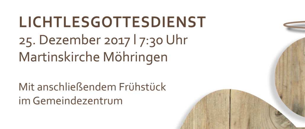 Herzliche Einladung zum Lichtlesgottesdienst am 25.12.17 um 7:30Uhr in der Martinskirche – dieser Morgen steht unter dem Motto “Engelsgleich und Federleicht”. Anschließend findet im Gemeindezentrum ein gemeinsames Frühstück statt, bei dem gute Gespräche entstehen.